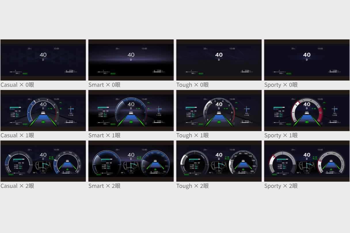 4つのテイスト(Casual/Smart/Tough/Sporty)と3つのレイアウトの中から、好みに合わせて表示を変えられるメーター。マルチインフォメーションディスプレイは、同時に複数の情報が見られるよう、左/中央/右の3種類を表示します。