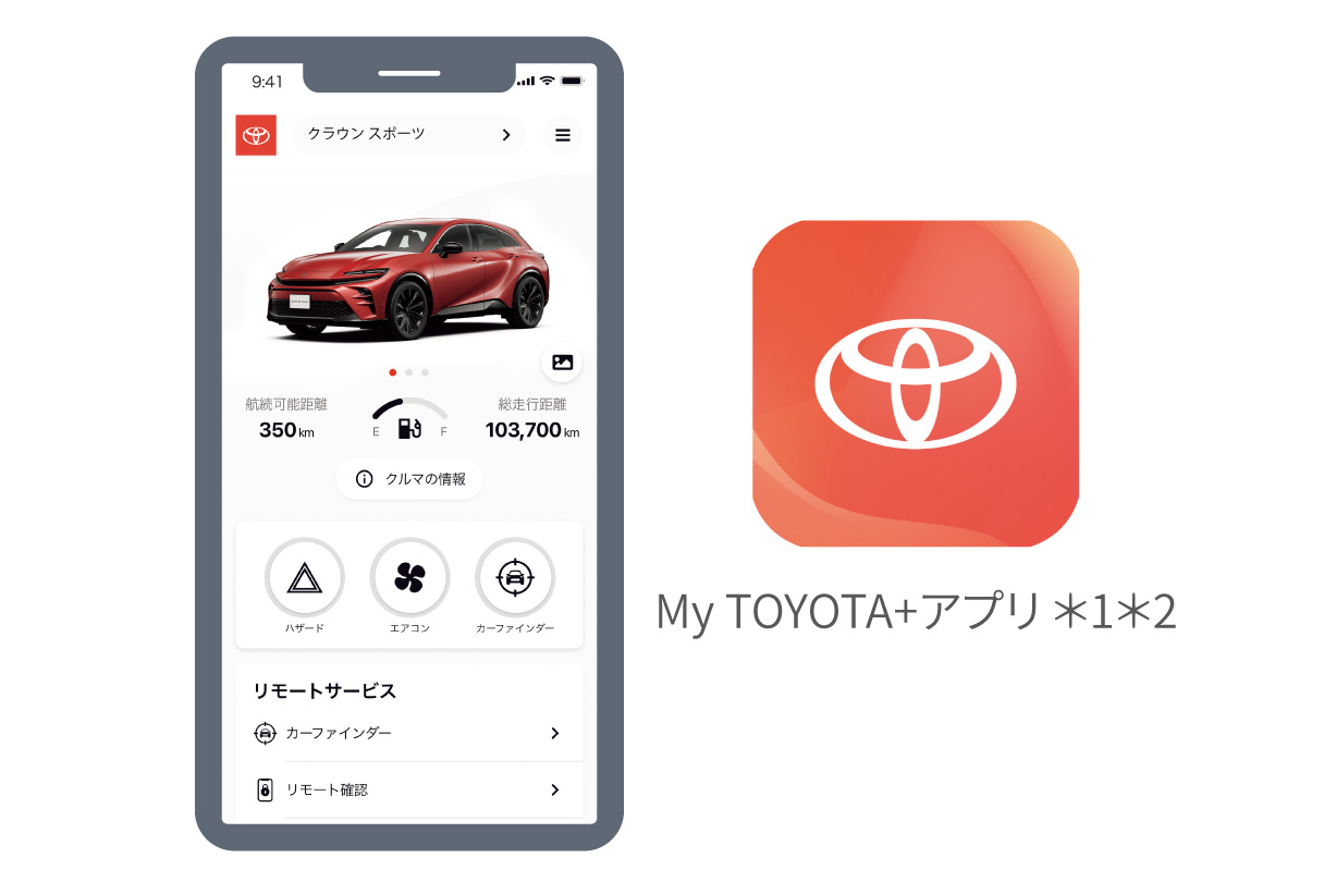 *1. スマートフォンアプリ「My TOYOTA+」のインストールが必要です。 *2. ご利用には、T-Connectスタンダード(22)の契約と「TOYOTAアカウント」の取得が必要となります。また初度登録日から5年間無料(6年目以降有料)となります。