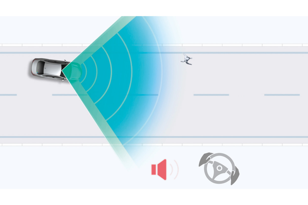 シフト操作時における急発進・急加速を抑制し、衝突時の被害軽減に寄与します。例えば、後退時に衝突して慌てたドライバーが、アクセルを踏み込んだままシフトを「R」から「D」へ変更した際、表示で注意を促し、ハイブリッドシステム出力を抑制。また後退時、必要以上にアクセルを踏み込んで速度が上がりすぎるのを防ぐために、ハイブリッドシステム出力を抑えます。